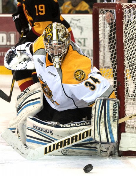 BELLEVILLE, ONT. (01/ 28/12) – Sarnia Sting goalie JP Anderson prepares to block a shot from the Belleville Bulls during a game at the Yardmen Arena on Saturday night, Jan. 28, 2012. The Bulls won 5-4 after the game was decided in a shoot out. Photo by Marta Iwanek.