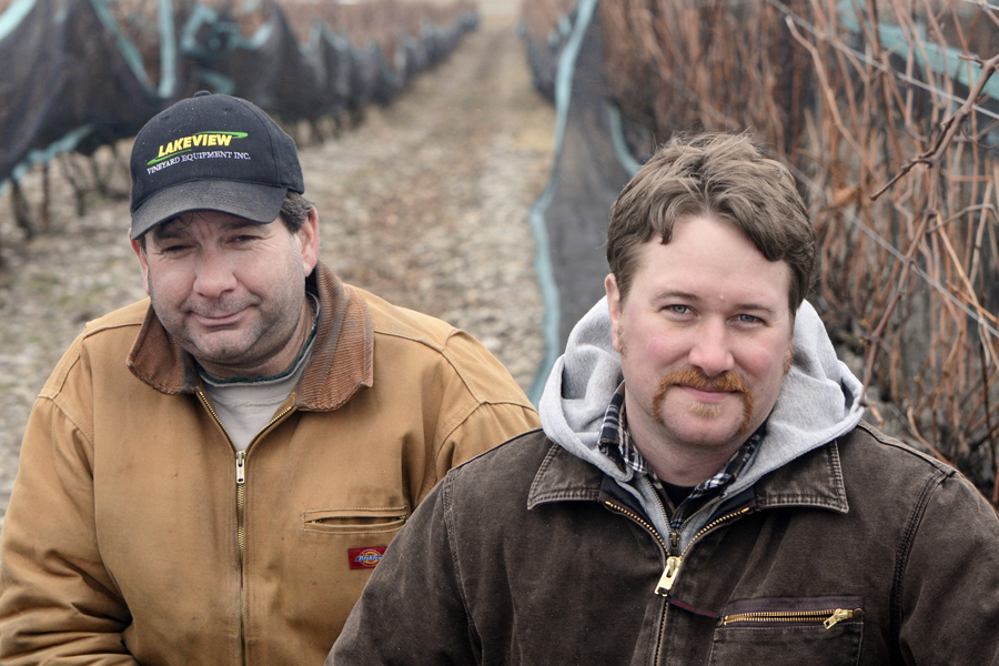 BLOOMFIELD ONT. (02/02/12) Alex Hunter vineyard manager for Huff Estates and his assistant Doug Gyde pose in the wineries crop of Frontenac Gris grapes. The grape is used to make a dessert wine called Zero De Gris. The process of making a dessert wine is the same as making an ice wine but cannot be classified as one because VQA's rules of what grapes can be used. Photo by Linda Horn