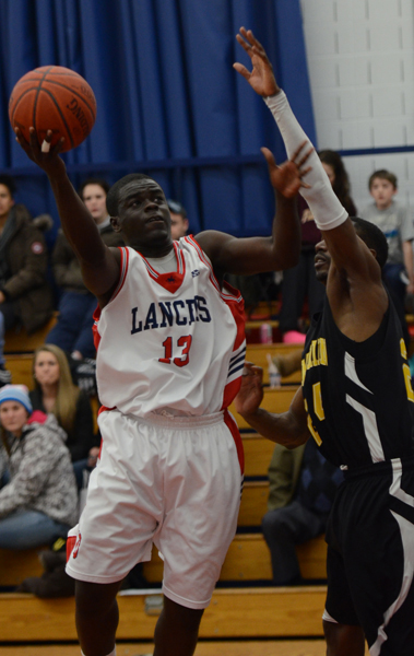 Loyalist Lancers Kevin Owusu reaches around a Cambrian Golden Shield player during their Friday game. The Lancers basketball team won both their games over the weekend. Photo by Christine Hosler.