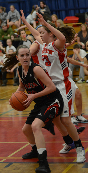 The Lady Lancers Sierra Cauley blocks a Seneca player during their Saturday game. The women went 0-2 this weekend, although Friday's game was an exhibition match against the Cambrian Golden Shield. Photo by Christine Hosler.