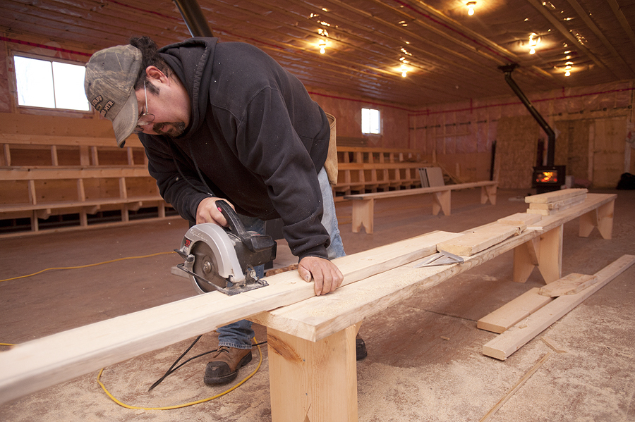 TYENDINAGA, Ont. (07/02/2012) -- Kevin Brant cuts a wooden board to use in contrcting the seating of the longhouse on Sadie's Lane in Tyendinaga Mohawk territory, on February, 7th, 2012. According to Brant the longhouse community is considering a pine wood interior, and loghouse style siding for the building. Photo by Cole Breiland.