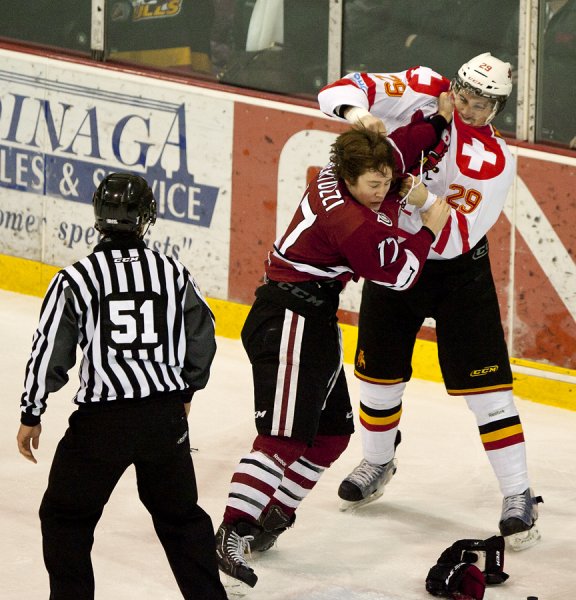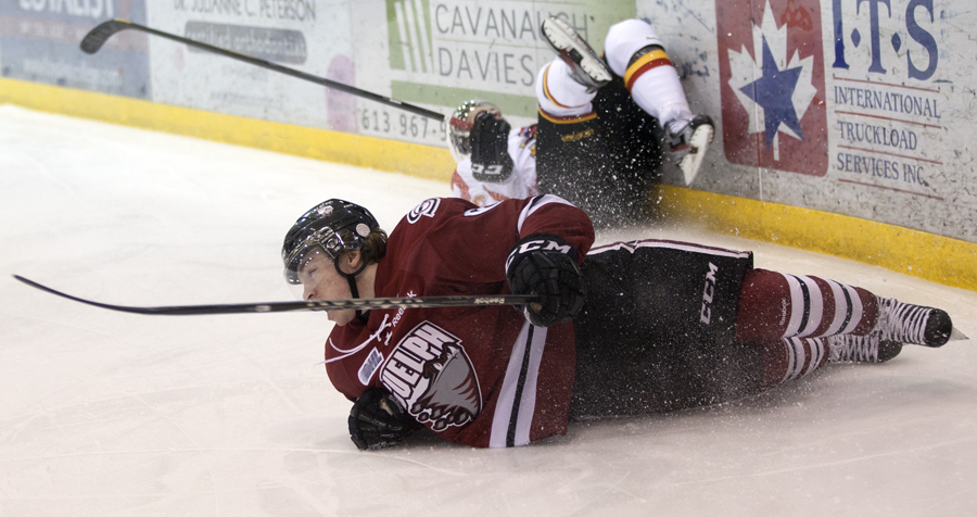 BELLEVILLE, Ont. (11/02/12) - Daniel Poliziani of the Guelph Storm and Joseph Cramarossa of the Belleville Bulls get tangled up along the boards of the Yardmen Arena in Belleville on Saturday, Feb. 11, 2012. Despite trailing after a second period goal by the Storm, the Bulls rallied to pull off a 3-1 win. Photo by Rachel Psutka.