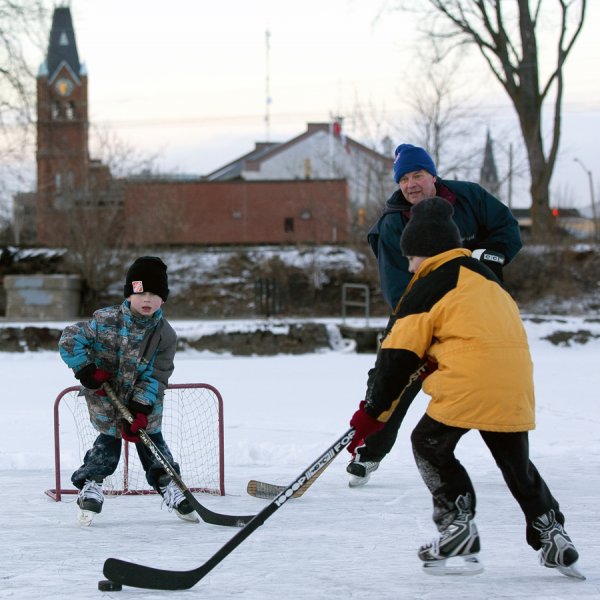 BELLEVILLE, Ont. (12/02/12) - Christopher Doyle, 9, lines up a shot against his brother Jonathan, 7, and dad Jim on a patch of frozen harbour near downtown Belleville on Sunday, Feb. 12, 2012. The Doyles were some of dozens taking in an outdoor skate on smooth ice this weekend. Photo by Rachel Psutka.