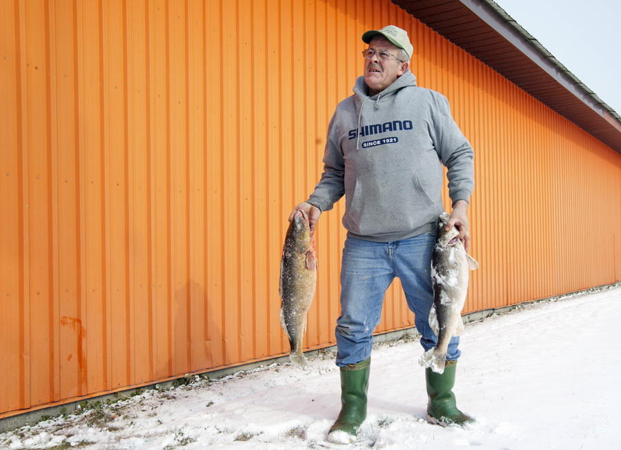 BELLEVILLE, Ont. (11/02/12) - Dave Fleming brings some of the pickerel caught during the fifth annual Knights of Columbus ice fishing derby on the Bay of Quinte into the weighing station at the Fish and Game Club in Belleville on Saturday, February 11, 2012. Organizers expected about 30 fish to be entered by the end of the day, and had a fairly normal turnout despite poor ice conditions. Photo by Rachel Psutka.