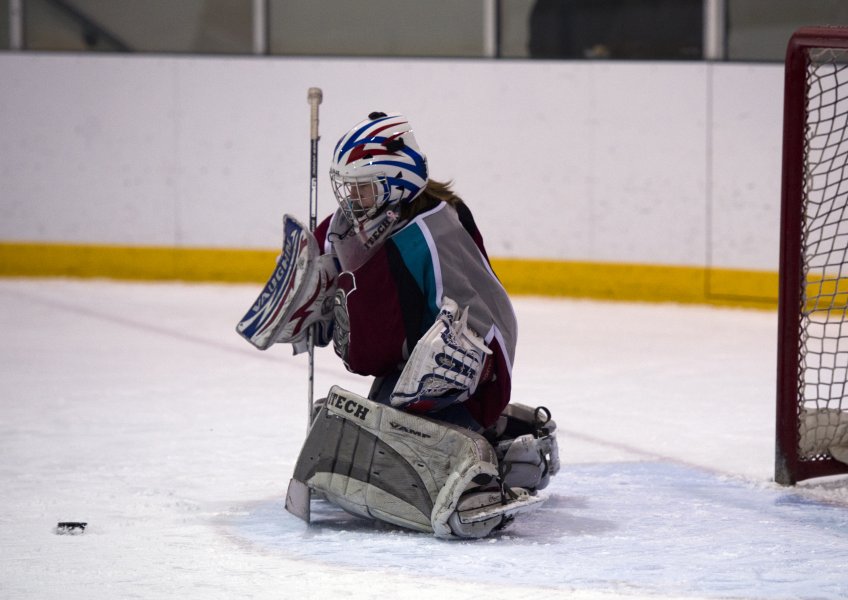 BELLEVILLE, Ont. (5/3/12) - Bre Bunnett of the Moira Knights makes one of over 30 saves during the COSSA championship game in Belleville Ontario Monday March 5. It wasn't until 12.1 seconds remaining that the St. Theresa Titans finally managed to solve Bunnett.  Photo by Andre Lodder