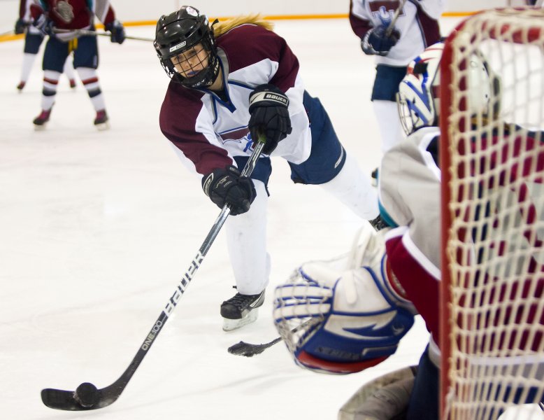 BELLEVILLE, Ont. (5/3/12) - A member of the St. Theresa Titans protects the puck as she enters the offensive zone during the COSSA championship game in Belleville, Ont. on March 5. The Titans won their third consecutive COSSA championship. Photo by Andre Lodder