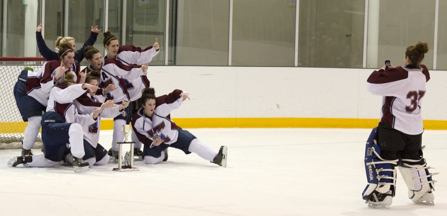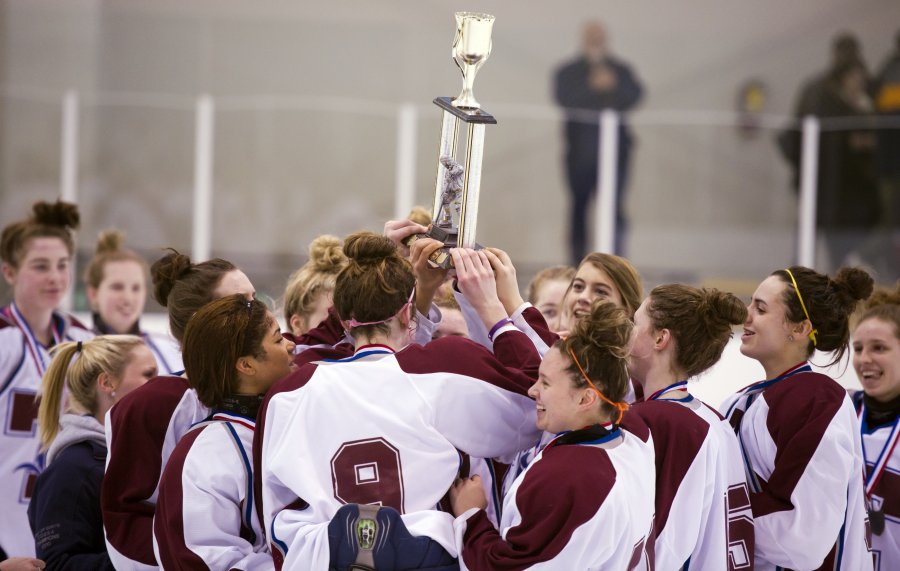 BELLEVILLE, Ont. (5/3/12) - The team celebrates with the trophy after the St. Theresa Titans topped the Moira Knights in the COSSA championship game in Belleville Ontario Monday March 5. CJ Tipping took a shot that made it's way to the back of the net with just 12.1 seconds left on the clock in the third period finally solving Knights goaltender Bre Bunnett after peppering her with shots throughout the game. Photo by Andre Lodder