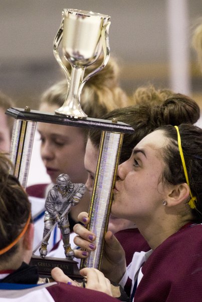 BELLEVILLE, ON (05/03/2012) - Hanna Bunton of the St. Theresa's Titans kisses the OCSSA trophy after defeating the Moira Trojans 1-0 in at the Yardmen Arena on March 3, 2012. Photo by Dan Pearce