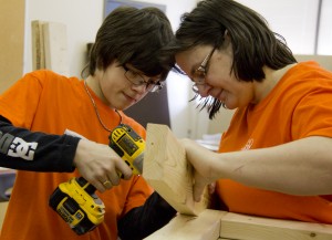 BELLEVILLE, Ont. (02/02/12) - Myles McMurter (left) is shown how to properly build a dog house by Tammy Hurrell during the I'm Set Up for College event held at Loyalist. photo by Meagan Pecjak