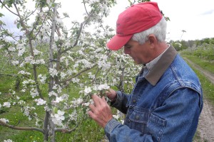REDNERSVILLE, Ont. (10/05/2012) Colin Campbell, one of the two owner-operators of Campbell’s Orchards, inspects an apple blosom. Photo by Tyson Leonard.