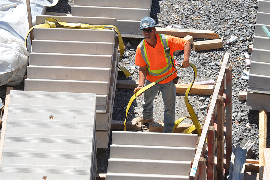 BELLEVILLE, Ont. (09/07/2012) A construction worker on the grounds of the Quinte Consolidated Courthouse rigs up stairs to be lifted into the building. Photo by Marc Venema.