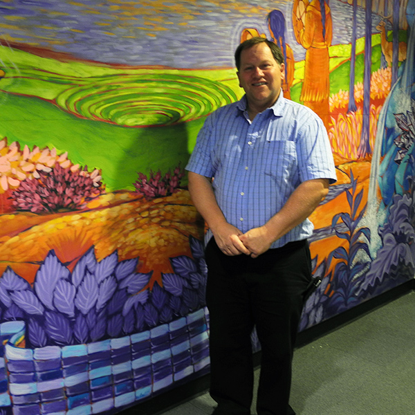 Paul Latchford coordinator of Aboriginal Services at Loyalist College in front of art displayed at the Aboriginal Center at Loyalist College. Photo by: April Lawrence.