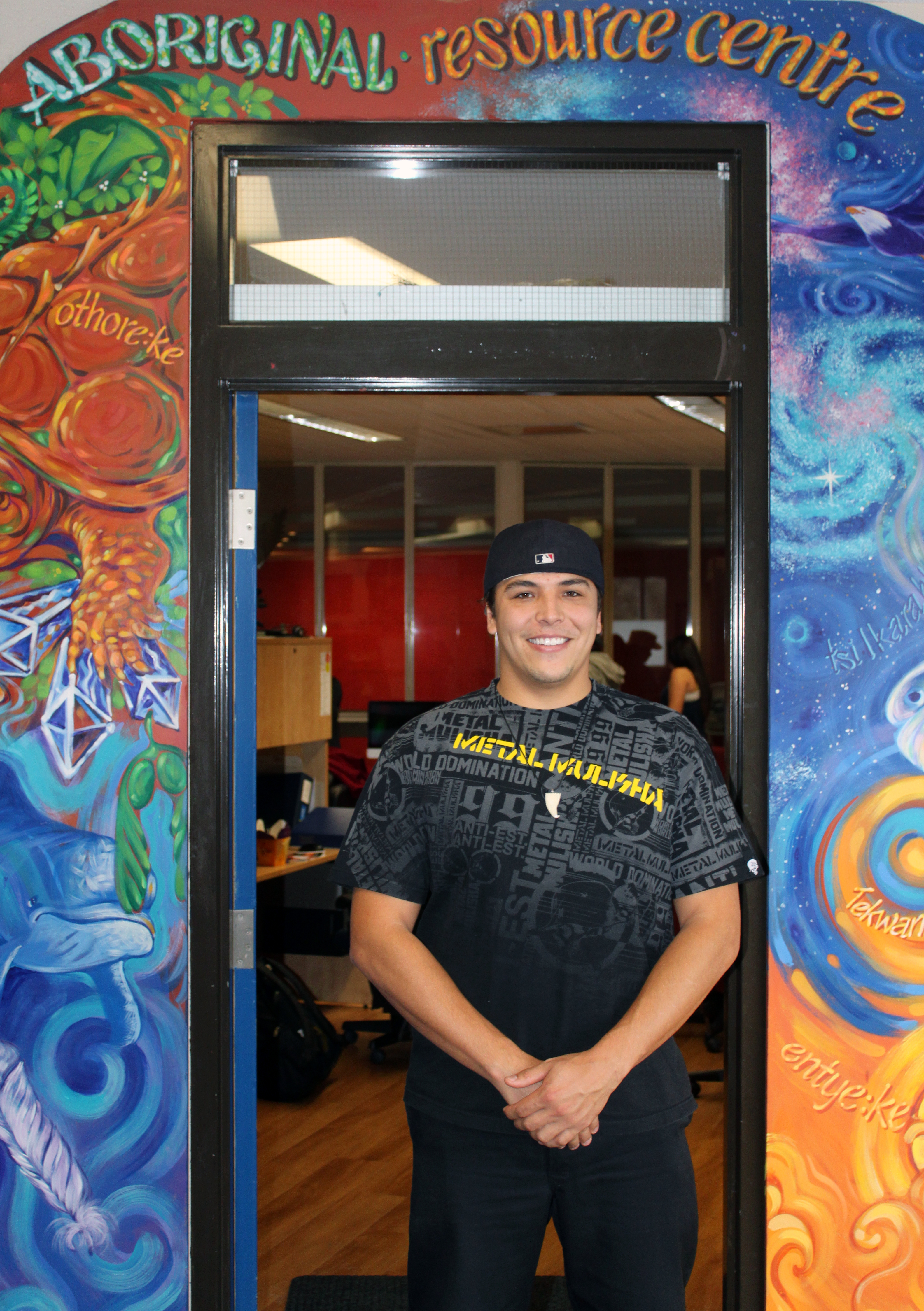 Ronald Leaman is from the Magnetawan First Nations. He said he is offended when he sees people dressed up in cheap Pocahontas costumes with fake moccasins and headdresses. Leaman, a second year student in the custom border services program at Loyalist College, works in between classes in the college’s Aboriginal Resource Centre. Photo By Tyson Leonard.