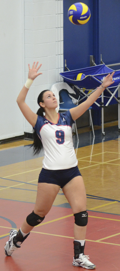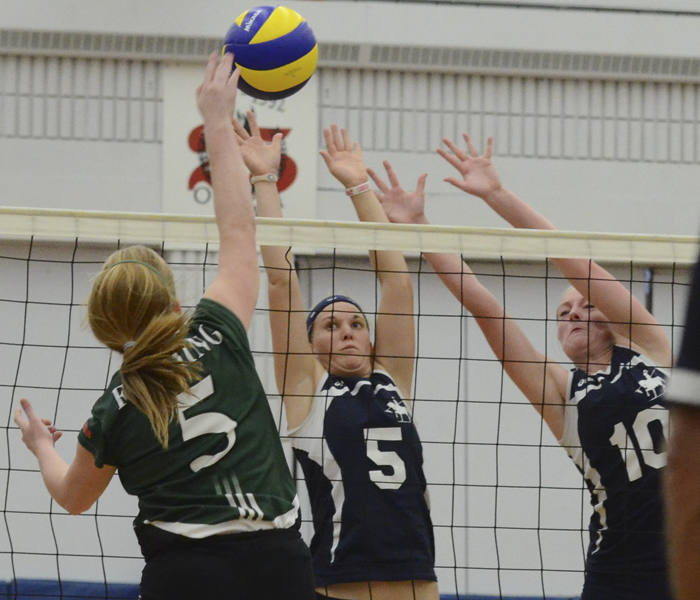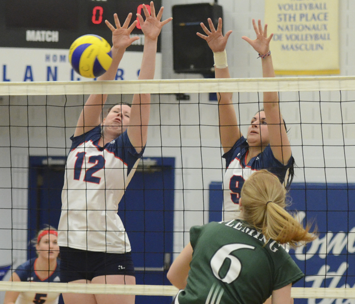Lancer veteran and new captain Kirsten Talsma (5) gets some help from Kristen Curtis (10) to block a spike from Fleming in exhibition action on September 26th. Talsma has just broken the service ace record, previously held by Landis Doyle of Humber. Photo by Taylor Renkema.