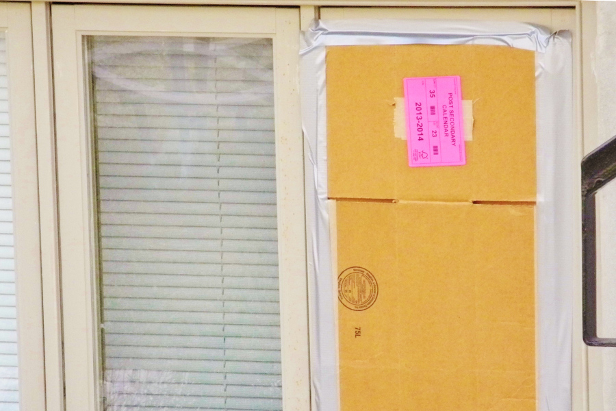 BELLEVILLE (06/11/12) Cardboard still covers A window on Tuesday that was broken during an incident on residence almost 2 weeks ago. Photo by Matt Blair.