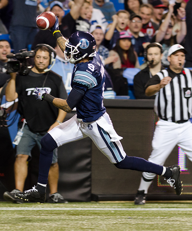 TORONTO, Ont. (11/11/2012) – Maurice Mann makes his first touchdown of the season playing with the Toronto Argonauts Nov. 11, 2012 at the Rogers Centre in Toronto, ON. The Argonauts secured their spot to the semi-finals playing against the Edomonton Eskimos winning 42-26. Photo by Alicia Wynter