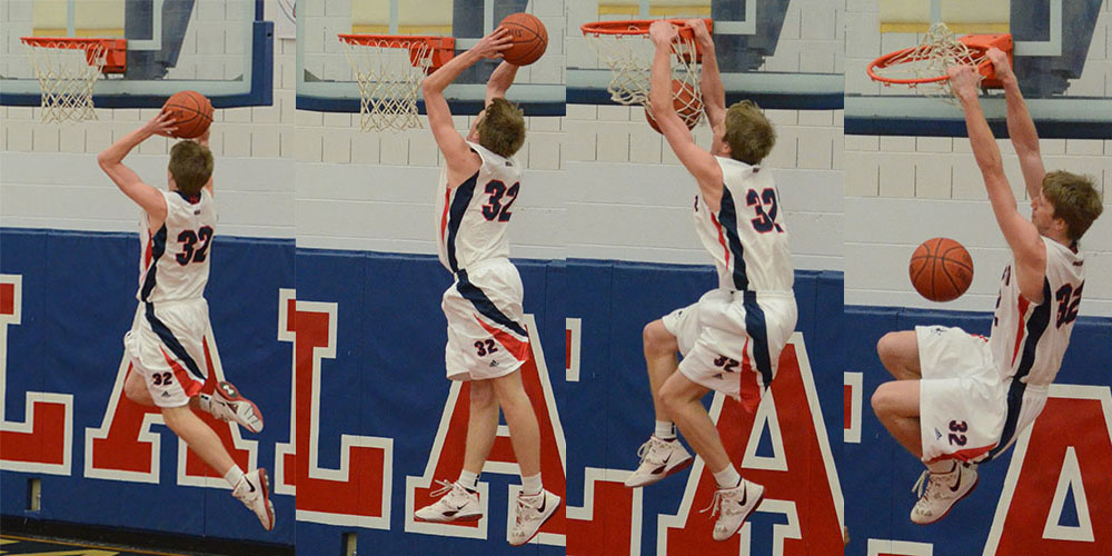 Lancer forward Brayden Gohn dunks the ball in this compilation of four images. Photo by Taylor Renkema.