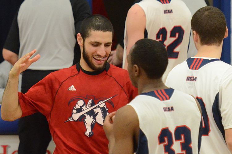 New Lancer guard Adeel Sahibzada celebrates with friend and teammate Pat Kalala celebrate after a victory over the Georgian Grizzlies on Jan. 12. Photo by Taylor Renkema.