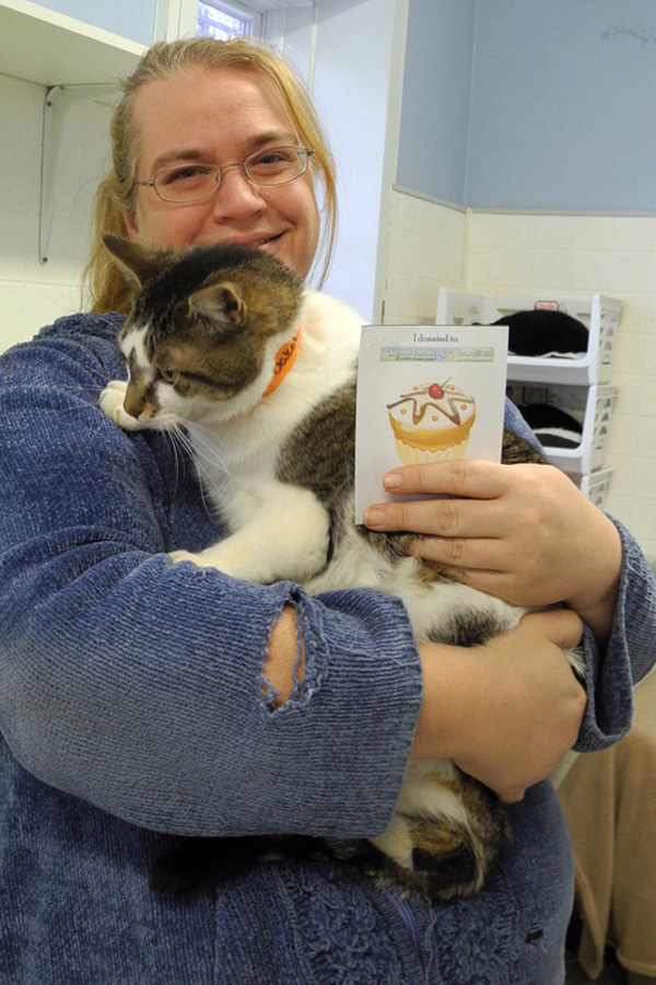 BELLEVILLE (23/01/13) Jennifer Nicholls, and one of the cats up for adoption at the Quinte Humane Society, show off one of the paper cupcakes for National Cupcake Day. Photo by Kristen Oelschlagel.