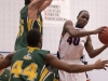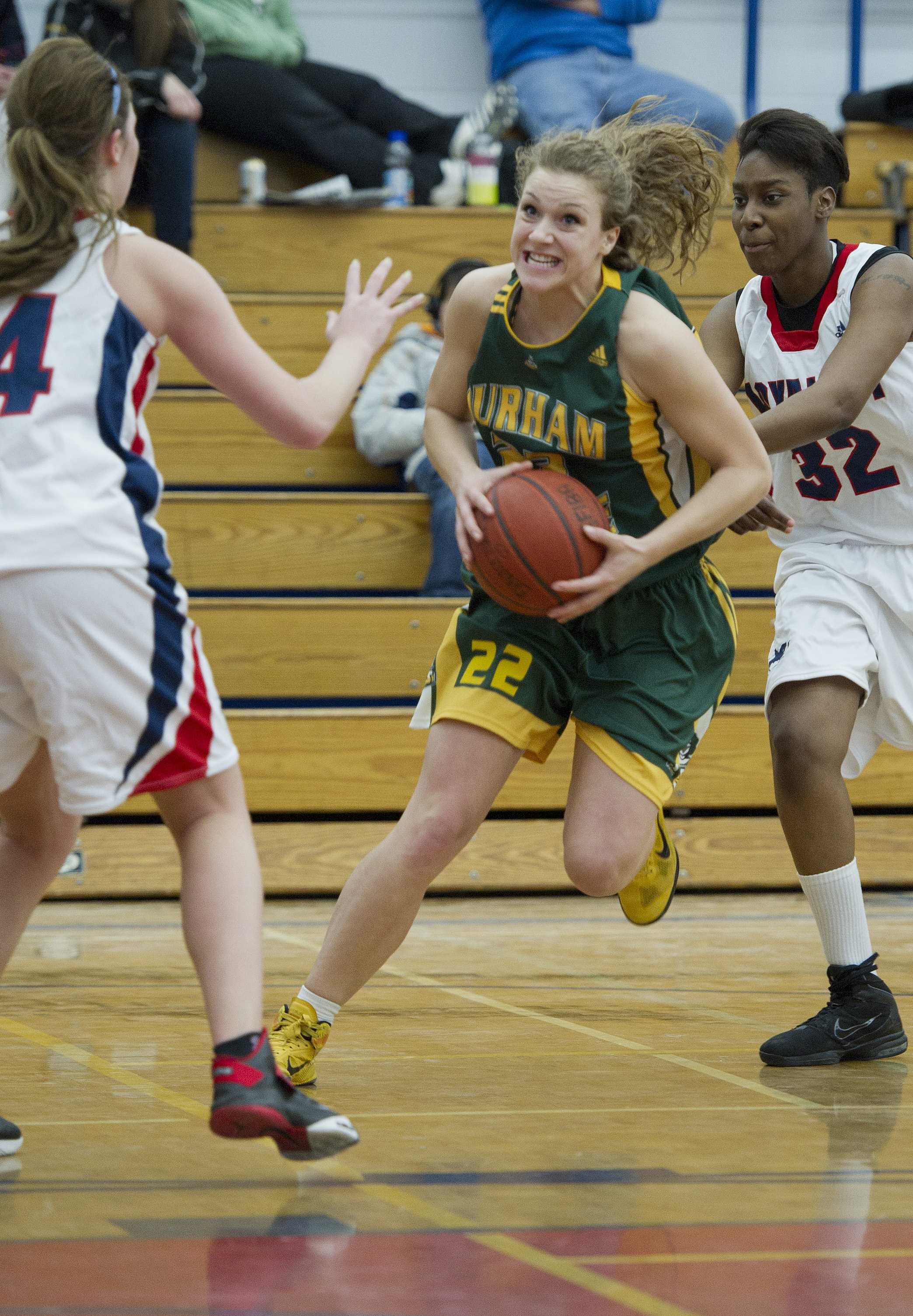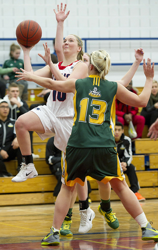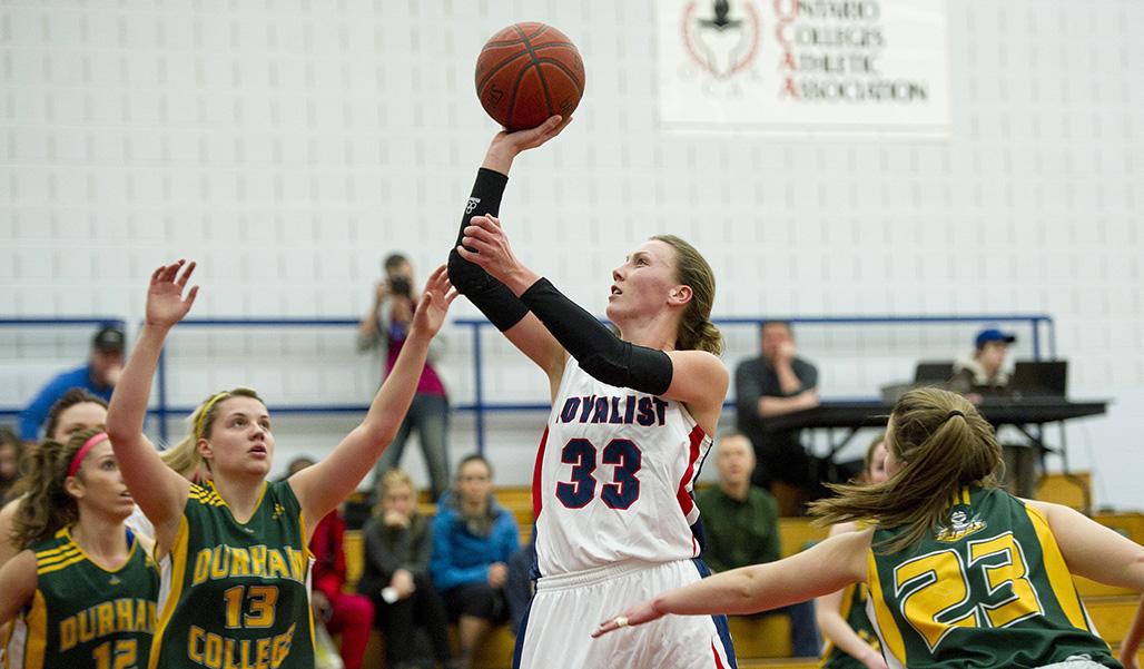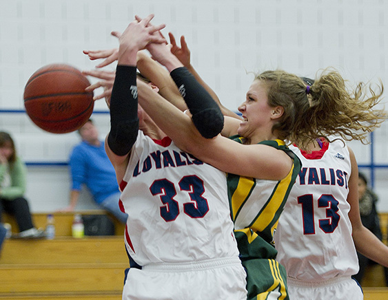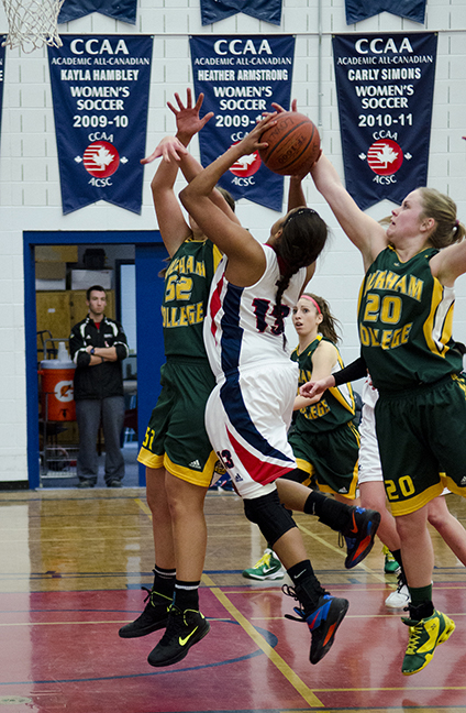 BELLEVILLE, Ont (02/05/2013) – Loyalist Lancers forward Nikea Worrell drives to the basket against Durham Lords forward Erica Angelo, while Kelsey Hare reach’s in from behind and stuffs Worrell on Tuesday night at the Loyalist College. Lancers won the game 72-35.