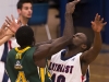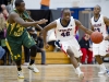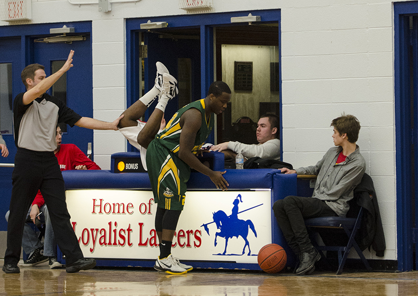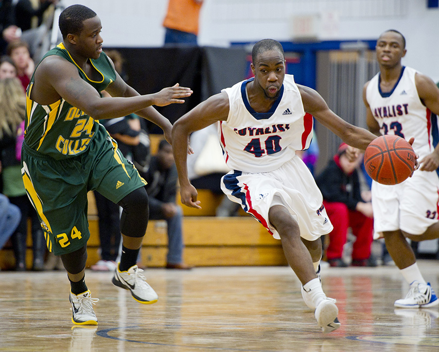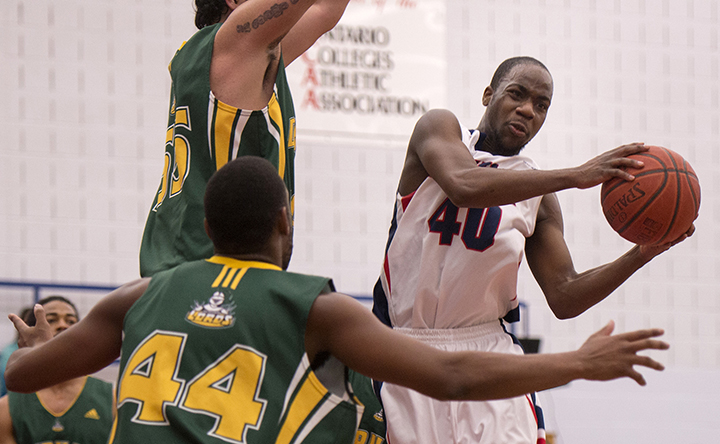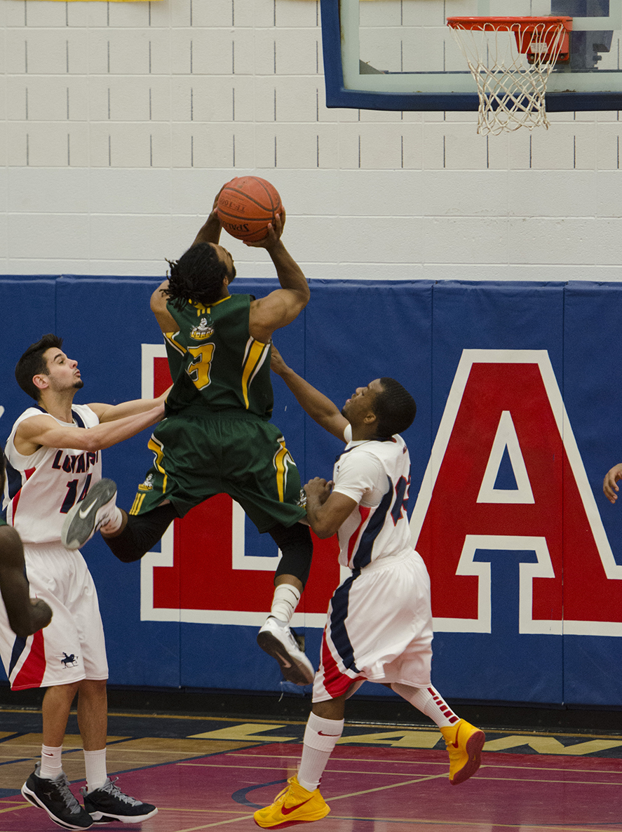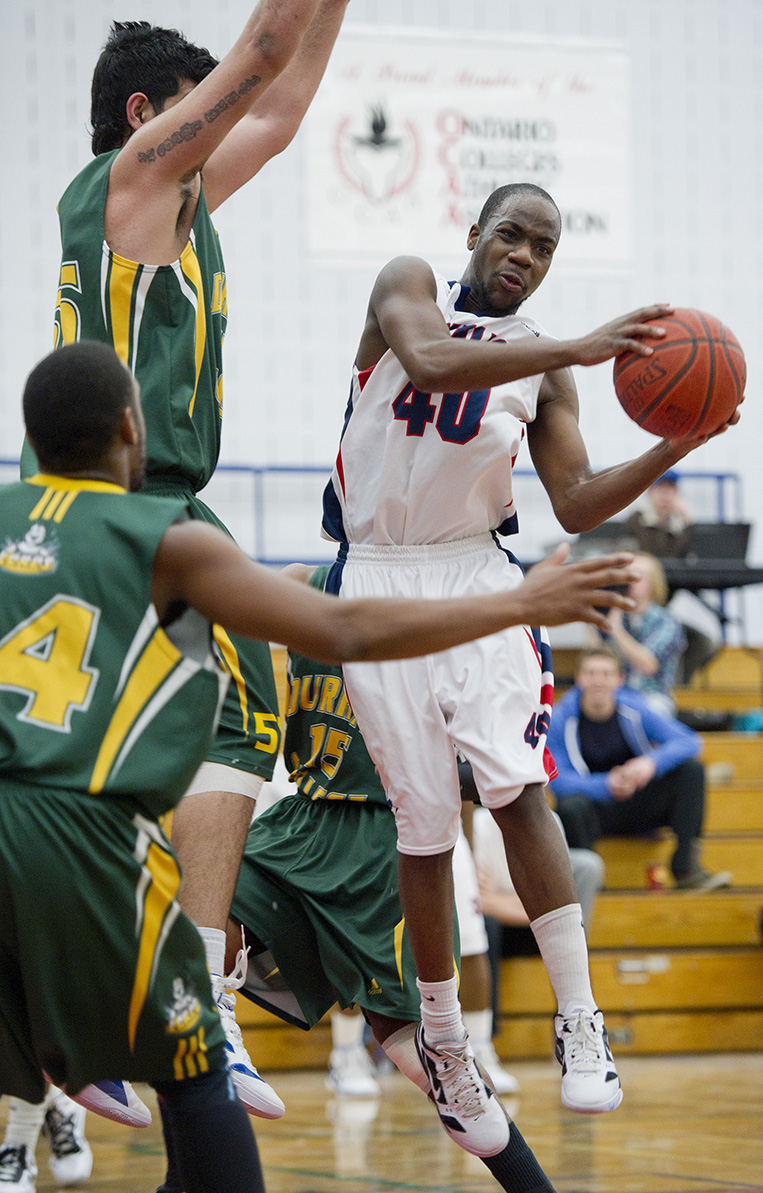 BELLEVILLE, Ont (02/05/2013) – Durham Lords guard Christoff Pierre drives towards the basket against Loyalist Lancers guards Steven Bailey, and Matthew Miller. The final score was 75-66 for the Lancers at home.