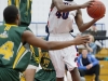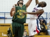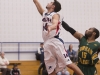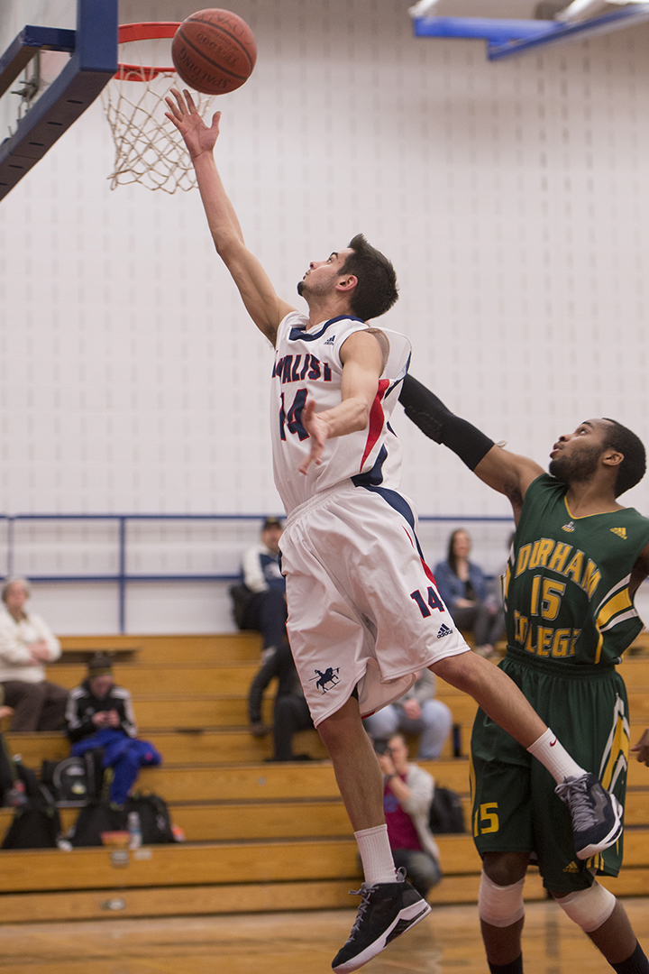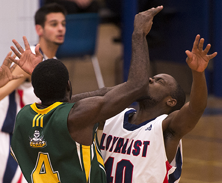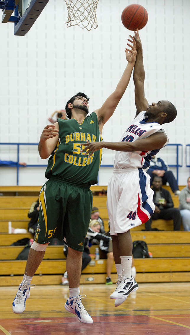 BELLEVILLE, Ont. (05/02/2013) -  Matthew Miller of the Lancers goes to score as Leke Bankole of the Lords watches on at the Loyalist College Lancers vs. Durham College Lords men's basketball game at the Loyalist College gym in Belleville, Ontario on Feb. 05, 2013. The Lancers won 75-66. Photo by Marta Iwanek.