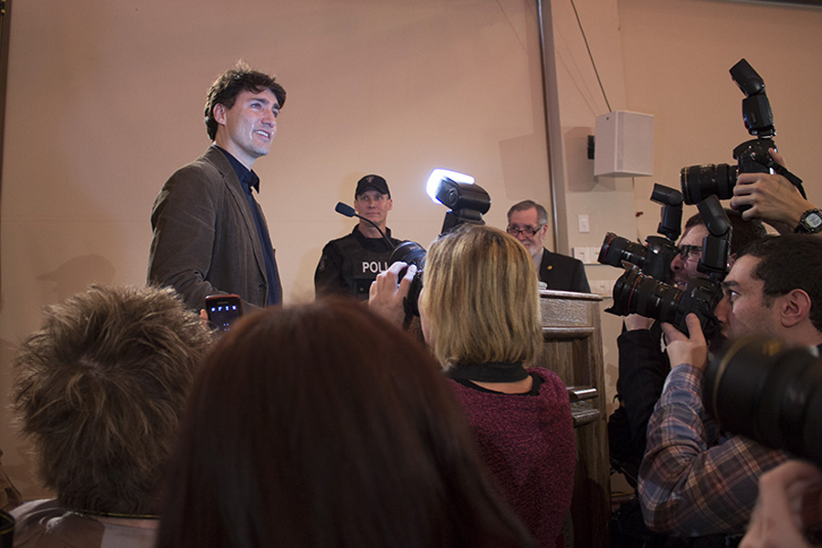 Quickly being ushered by his handlers, Trudeau moved to Loyalist’s Alumni Hall where people from the community and eager students awaited his presence, all the while being followed by the in-house media with ease.