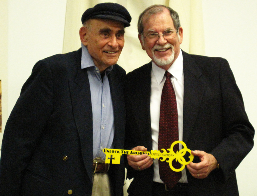 (BELLEVILLE, Ont. 05/26/11) Canadian journalist and author Peter C. Newman, presents Orland French, the President of the Hastings County Historical Society, with one of three keys to Belleville's historical archives. The Historical Society is raising money to move the archives to downtown Belleville. Photo by Jennifer Bowman