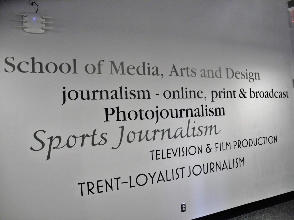 “I am delighted to welcome you to today’s celebration. We are delighted to announce the official opening of the Newsroom… spectacularly designed and which, as you will see later, is an outstanding learning environment for our students. The newsroom will be used by a variety of programs including: Journalism, Photojournalism, Sports Journalism, Television, the Trent-Loyalist Journalism program and Broadcast Engineering Technology. The newsroom will also serve as the main entrance into the Digital Media Centre that houses our newly built high-definition television studio, industry-standard radio facility, our newly launched Graphic Design and Fundraising and Development programs, renewed Advertising and Marketing Communication program, and Public Relations. We’re also here to celebrate the official launch of the Trent-Loyalist journalism program and the redeveloped QNet News site – Loyalist’s award-winning student-produced community online news service. ” – Maureen Piercy, President of Loyalist College
