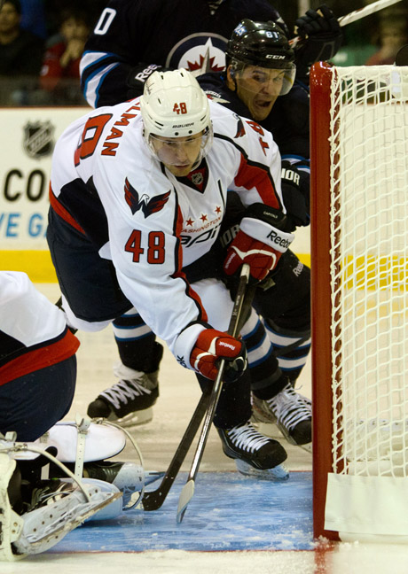 BELLEVILLE, Ont (09/14/2013) – Washington Capital Casey Wellman and Winnipeg Jet Austen Brassard battle it out in front of the net during the pre-season NHL match held at the Yardmen arena as part of Hockeyville 2013. Photo by James Wood
