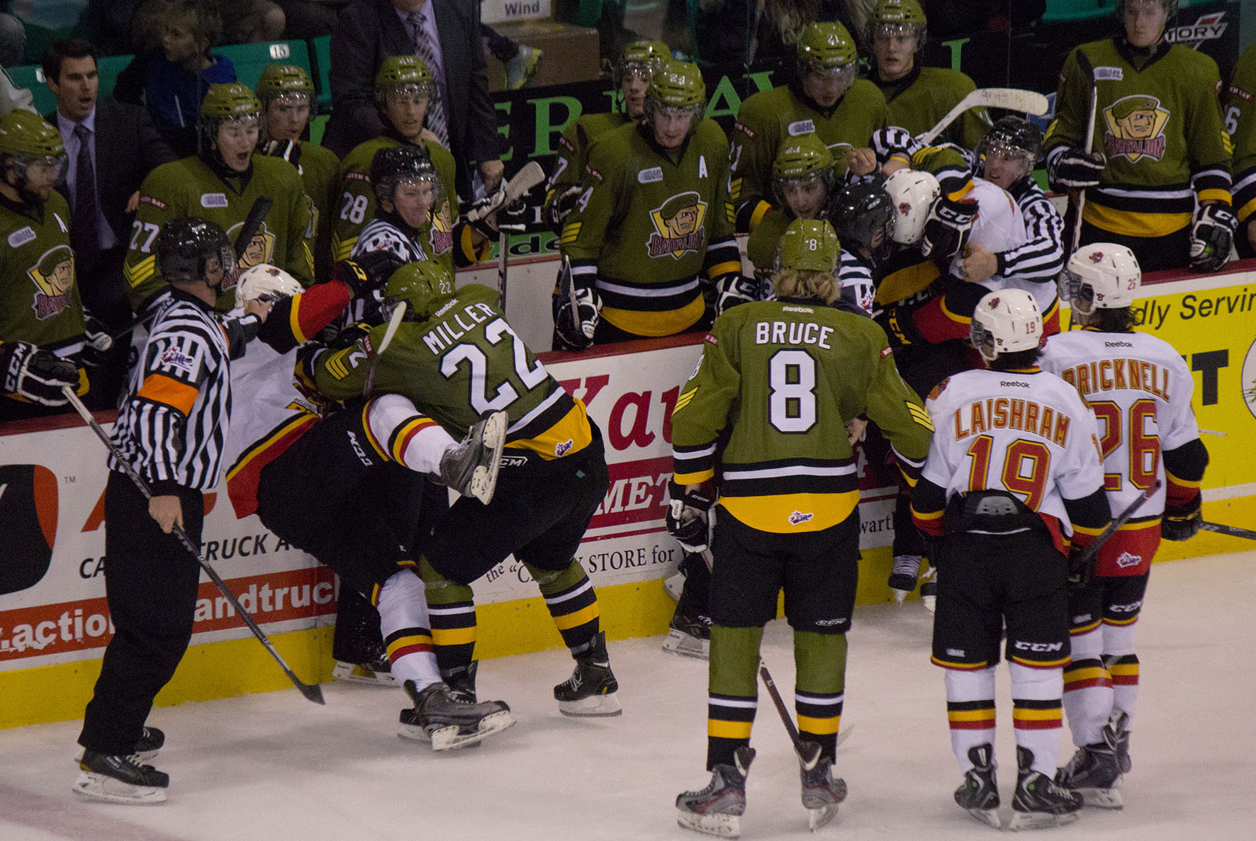 The North Bay Battalion rough up the Belleville Bulls during Saturday night’s game. Photo by Riley Maracle