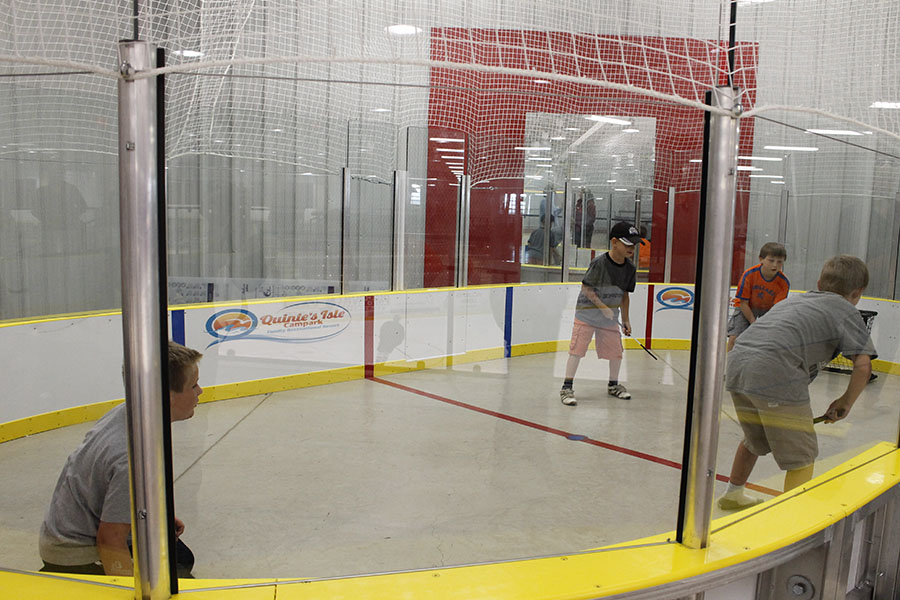 The new mini-stick arena in the Essroc Arena in Wellington, gives kids the chance to play hockey while they wait for practice or watch their siblings play. (L-r) Carter Knock, nine, Spencer Scott, nine, Cameron Osterhout, six, and Kasey Cocklin, nine, enjoy a game of mini sticks.