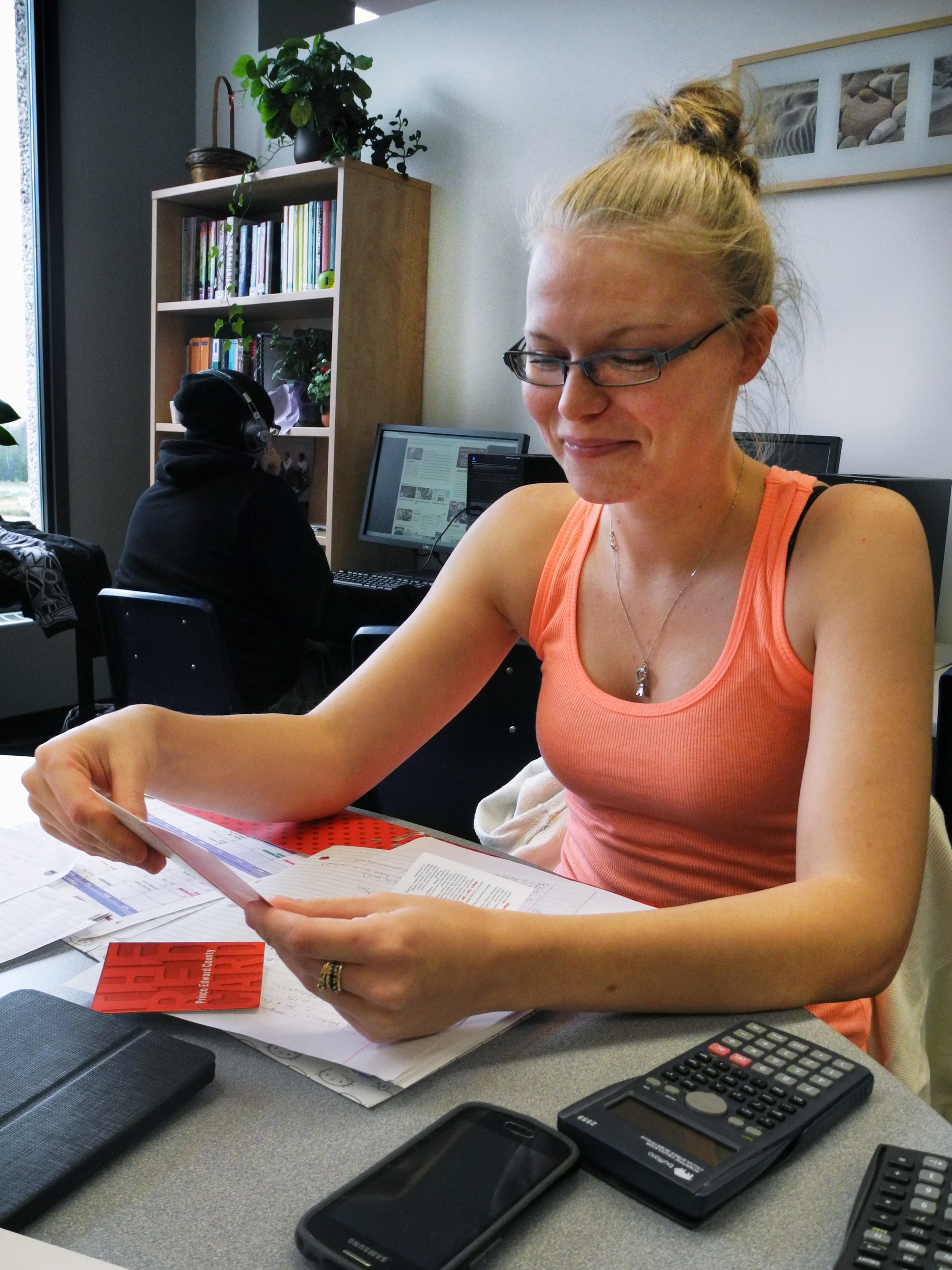 Third-year accounting student Karin Johansen sneaks a peek at this year’s Belleville Red Card in Loyalist College’s academic skills centre Oct 7. The project’s a product of the Prince Edward Children’s Services Network and the Hastings and Prince Edward District School Board. Photo by Amanda Lorbetski