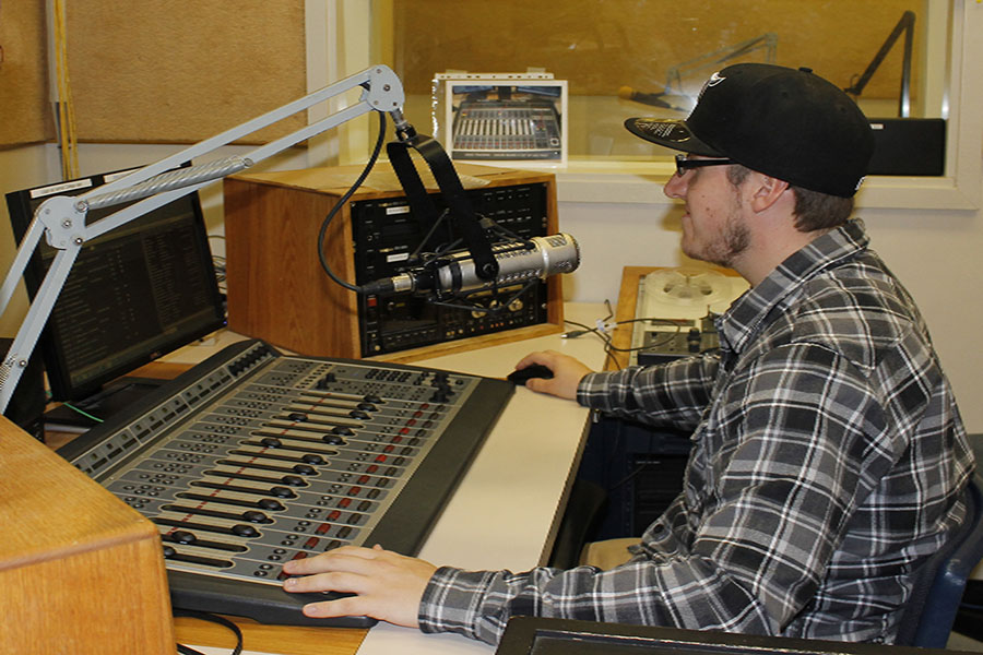 Ryan Buza a second-year radio broadcasting student, spends most of his time working on assignments in the radio studio. The long hours can be overwhelming but he does what he can to keep stress low. Photo by April Lawrence
