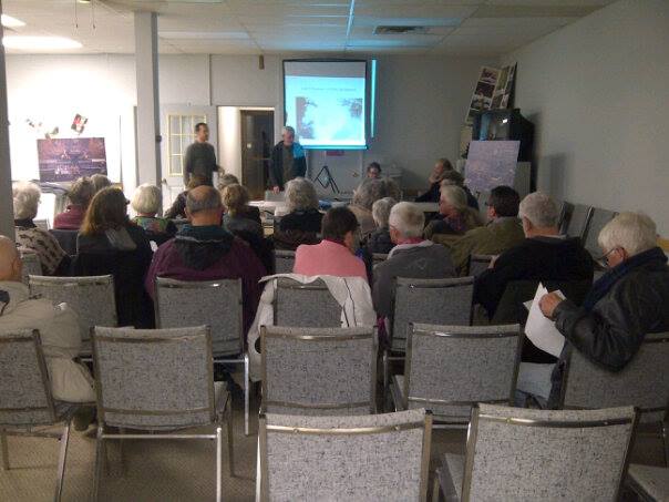 About 30 people gathered for a presentation about the Line 9 pipeline in Belleville. At the front of the room is John Lewis, the organizer of the event.