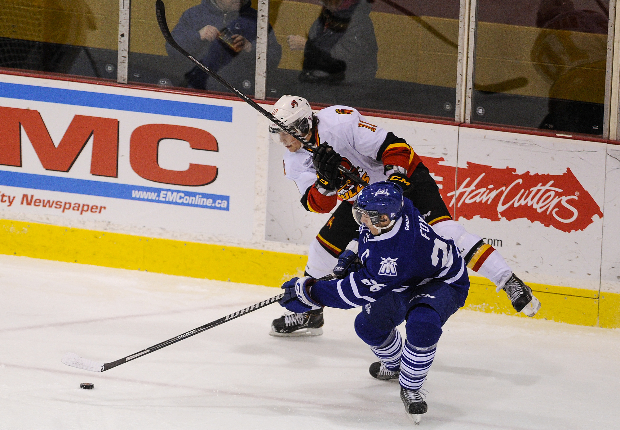 BELLEVILLE – Brett Foy (right) of the Steelheads skates to the puck with Jake Marchment of the Belleville Bulls. Photo by Justin Chin, Loyalist Photojournalism