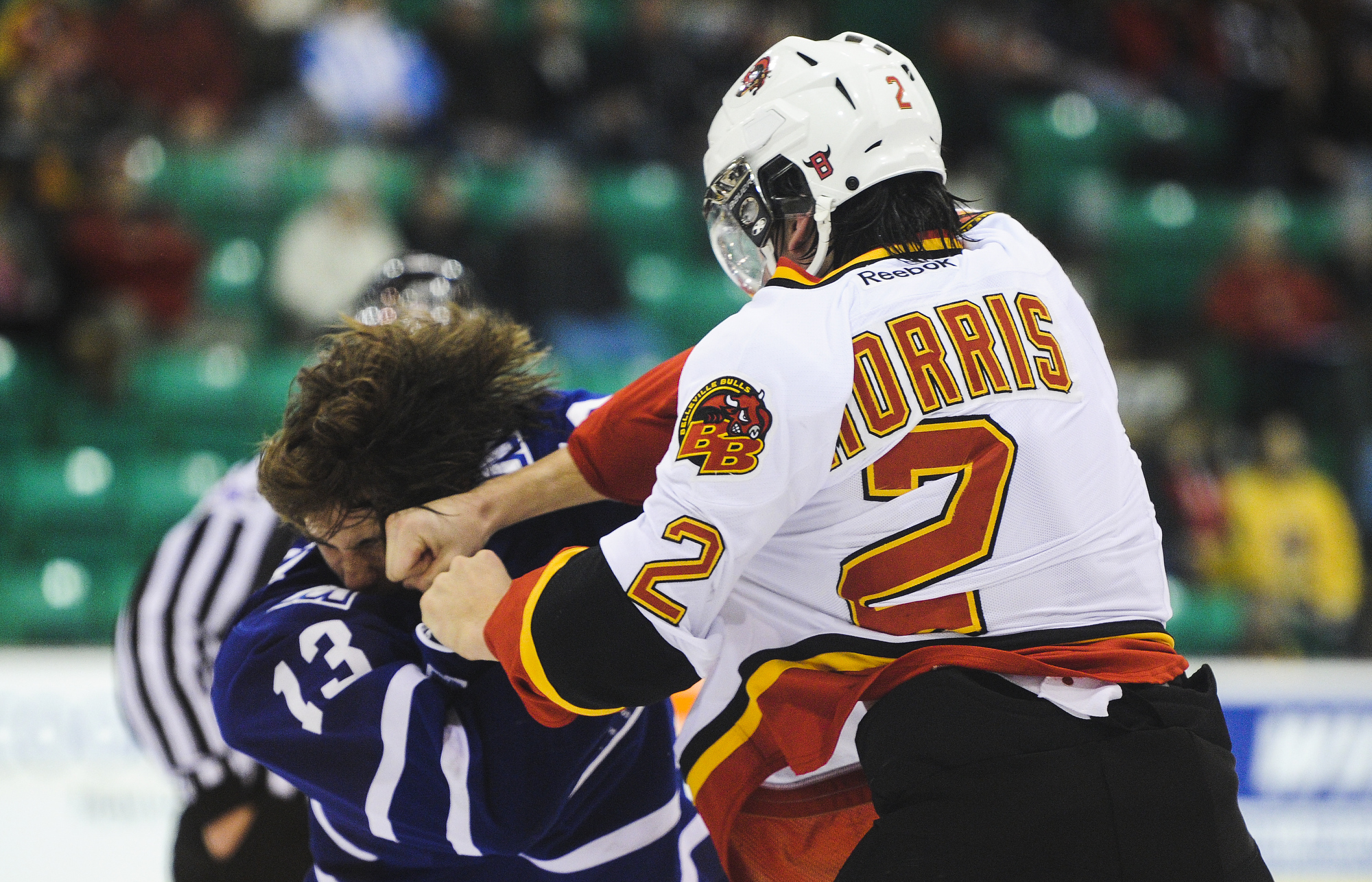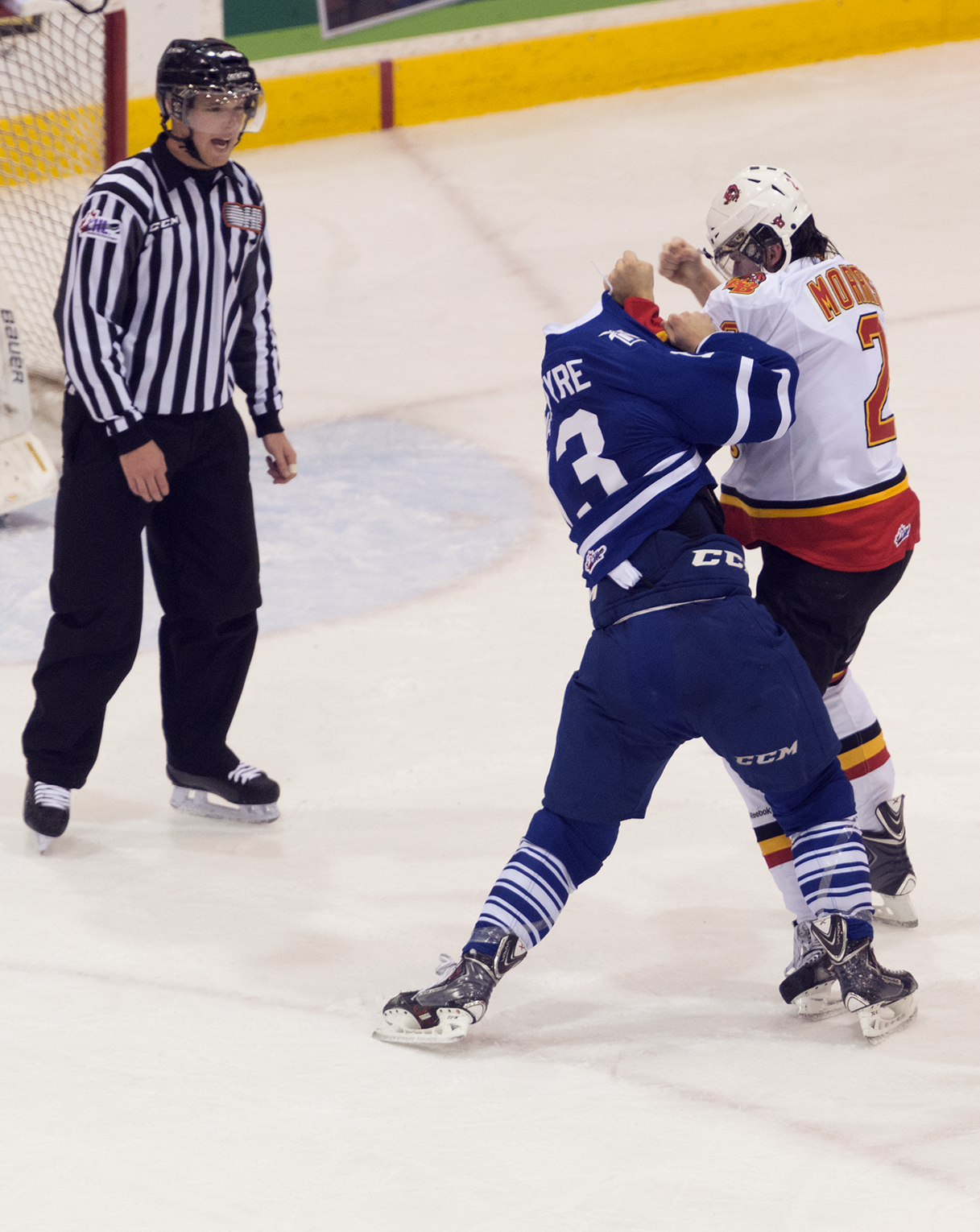 BELLEVILLE – Bobby MacIntyre (left) of the Mississauga Steelheads fights with Brody Morris of the Belleville Bulls during Wednesday night’s Ontario Hockey League game at the Yardmen Arena. The fight resulted in a five-minutes penalty for both players. The Bulls won 5-2. Photo by Justin Chin, Loyalist Photojournalism