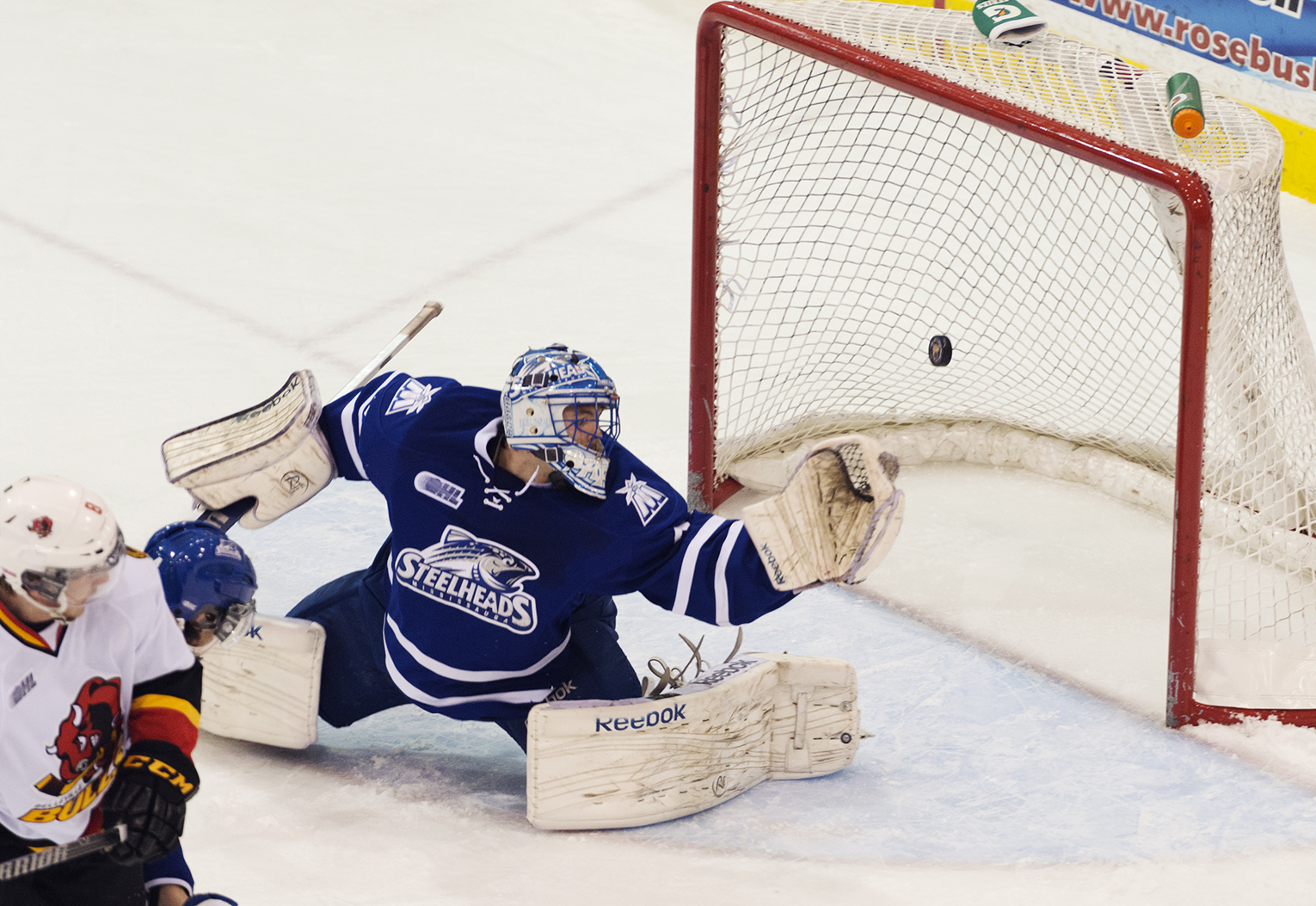 BELLEVILLE – Aaron Berisha scores the second goal of the night for the Belleville Bulls against Mississauga Steelheads goalie Spencer Martin. Photo by Sarah Taylor, Loyalist Photojournalism