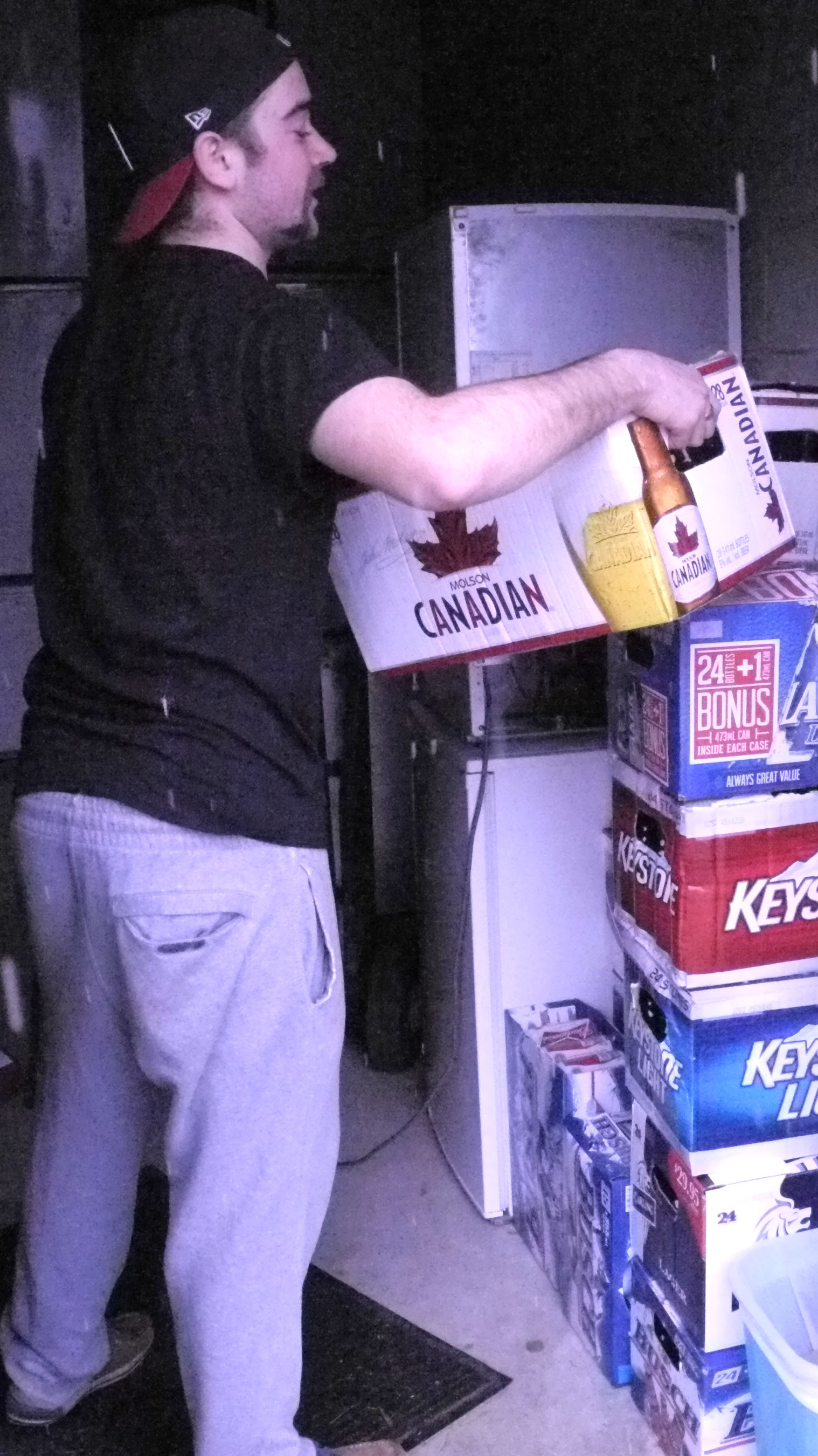 BELLEVILLE – Brent Waldie stacks the empties he is donating to the Movember cause. Photo by Riley Maracle