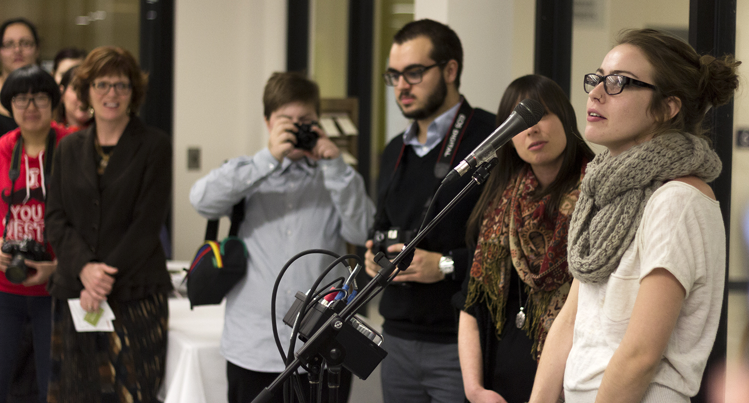 BELLEVILLE – Mandolynne Knott talks to the crowd about her love for art and why she loves Loyalist’s Art and Design Foundation program. Students in the program curated the show, and at the opening all had the opportunity to come up and say a little about about what they do and why they love it. Photo by Sonya Dronsfield, Loyalist Photojournalism