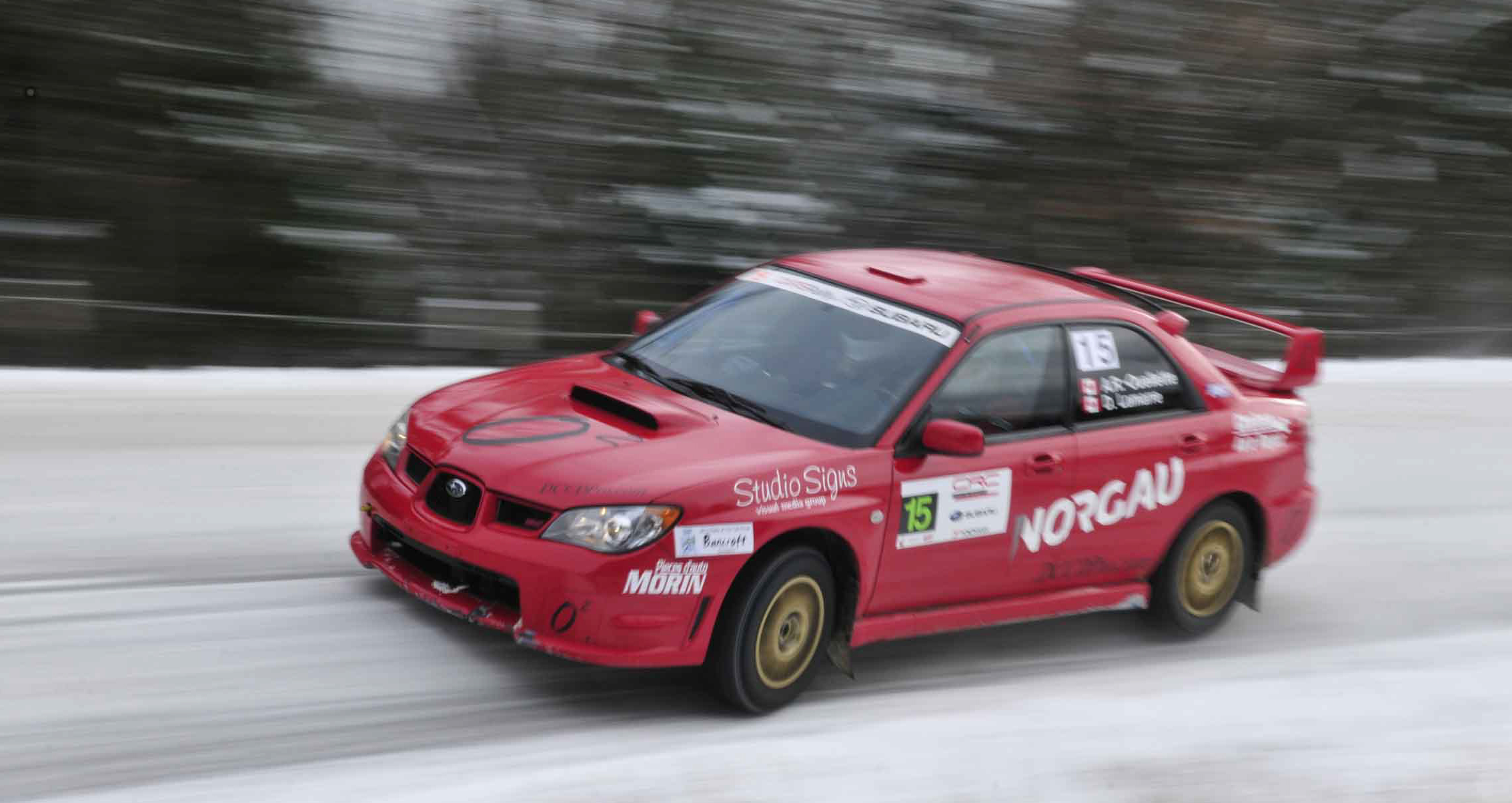 BANCROFT, Ont – Alexandre Ouellette and David Lamarre rounded a corner at the Rally of the Tall Pines on a cold snowy Saturday afternoon in their 2007 Subaru. The duo ended up withdrawing from the race. (Photo by Thomas Surian, Loyalist photojournalism)