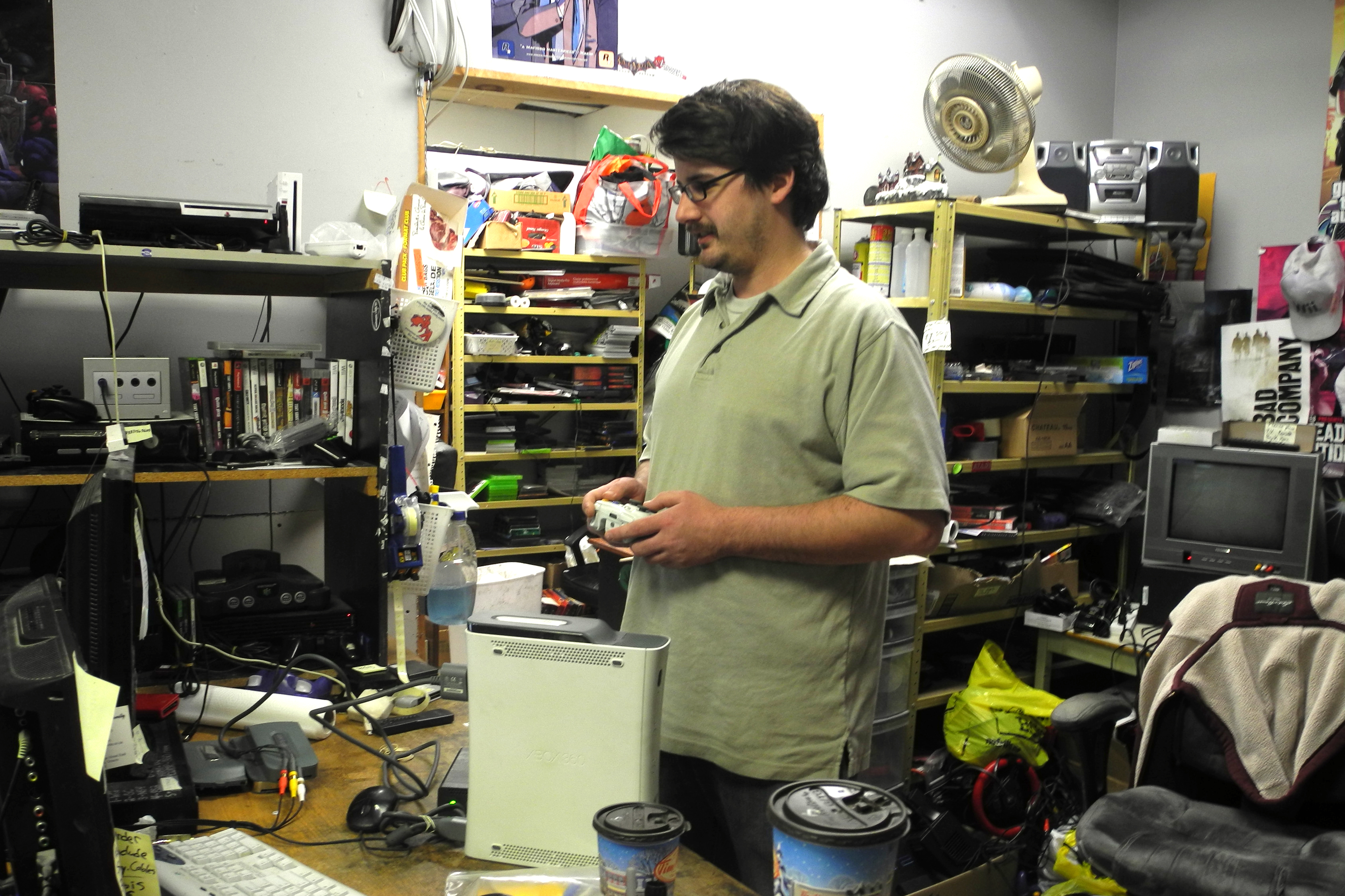 Dan Pearce, the gaming supervisor at Chumleighs used-electronics store in downtown Belleville, tests an XBox 360. Pearce says he expects the XBox 360 to be more popular than the new gaming consoles for the next year or so. Photo by Shelden Rogers