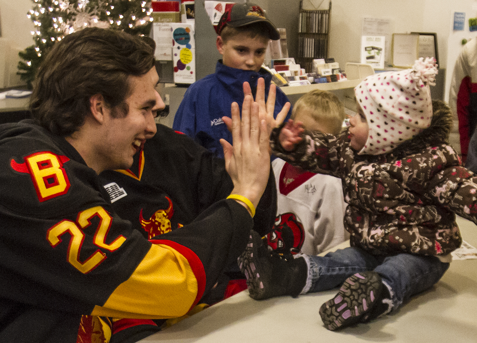 BELLEVILLE – Belleville Bull Mark Raycroft greets a young fan at the Quinte Arts Council Gallery during the Bulls’ meet and greet event Friday in various locations downtown. Photo by Julia Karpiuk, Loyalist Photojournalism