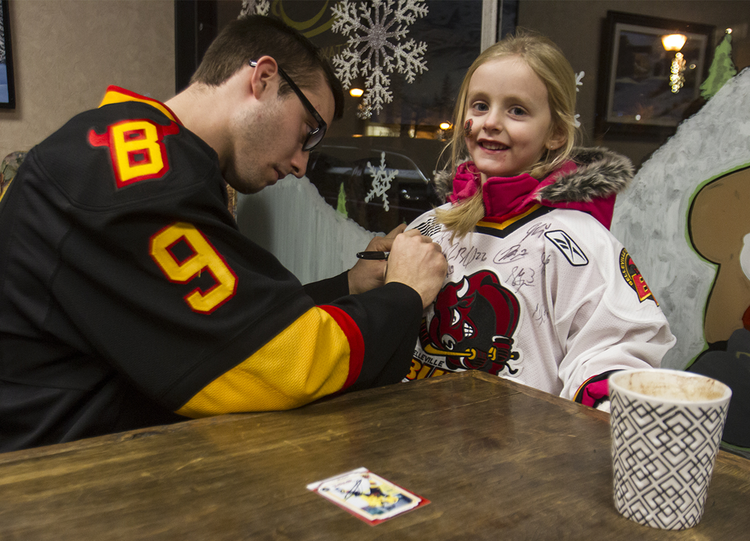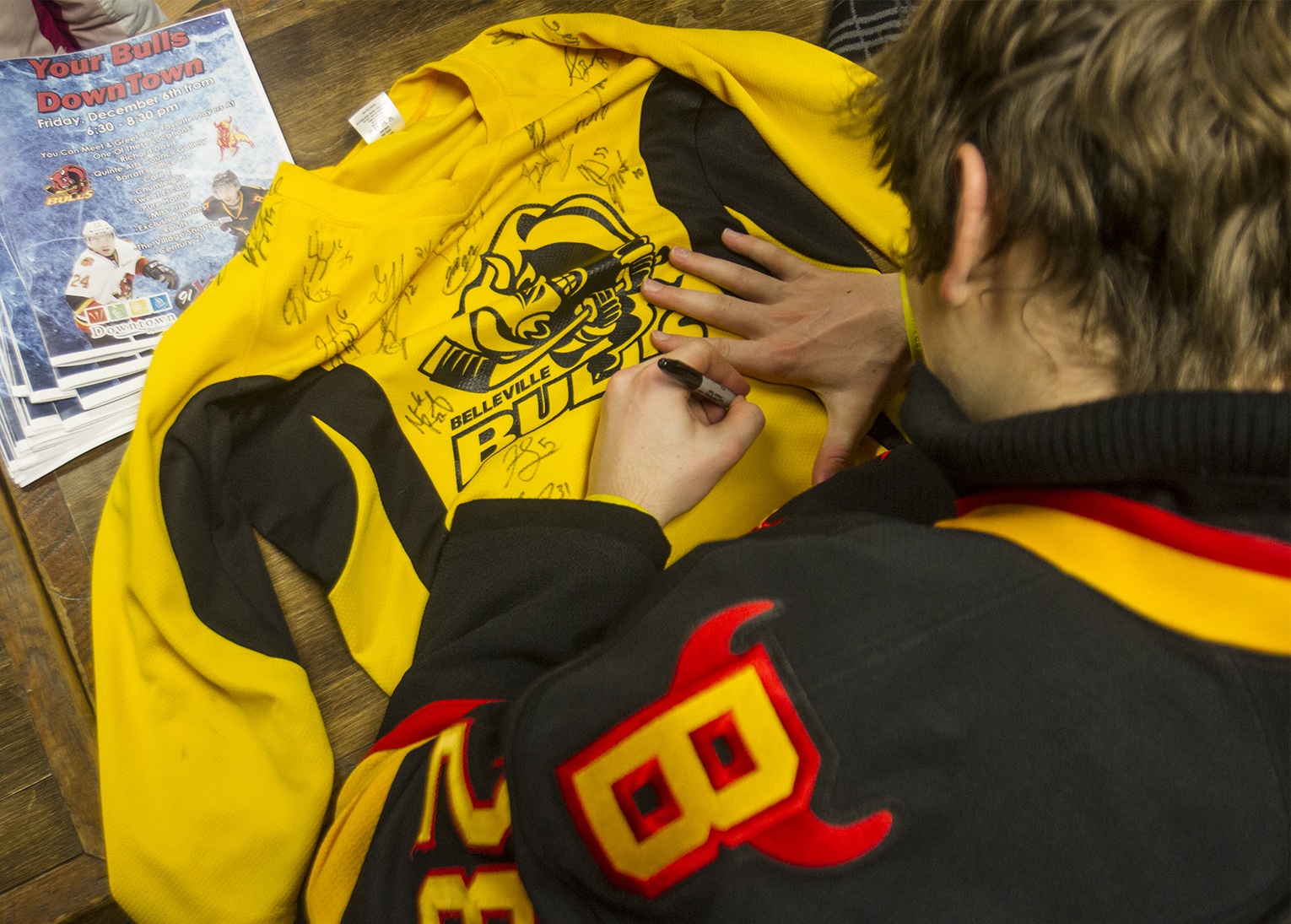 BELLEVILLE – Player David Tomasek, who plays centre, signs a jersey for a fan. Photo by Julia Karpiuk, Loyalist Photojournalism