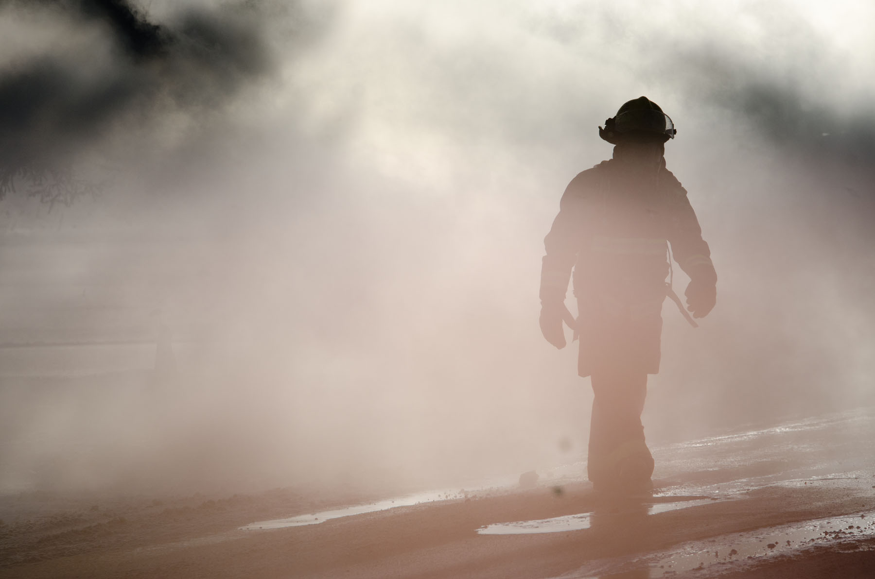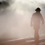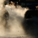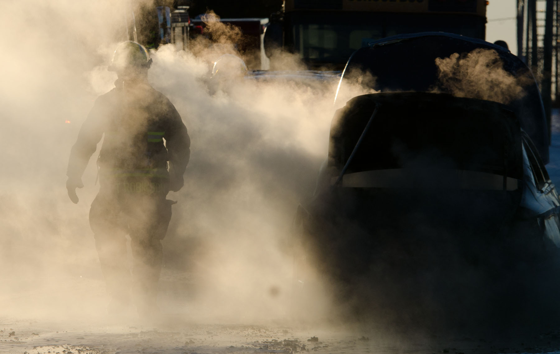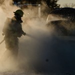 QUINTE WEST – A firefighter walks through steam coming from water being sprayed on the flaming car on Moira Street West. The blaze was brought under control quickly. Photo by James Wood, Loyalist Photojournalism