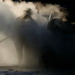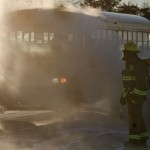 QUINTE WEST – An empty school bus rolls through the steam coming from water sprayed on the burning car. Photo by James Wood, Loyalist Photojournalism