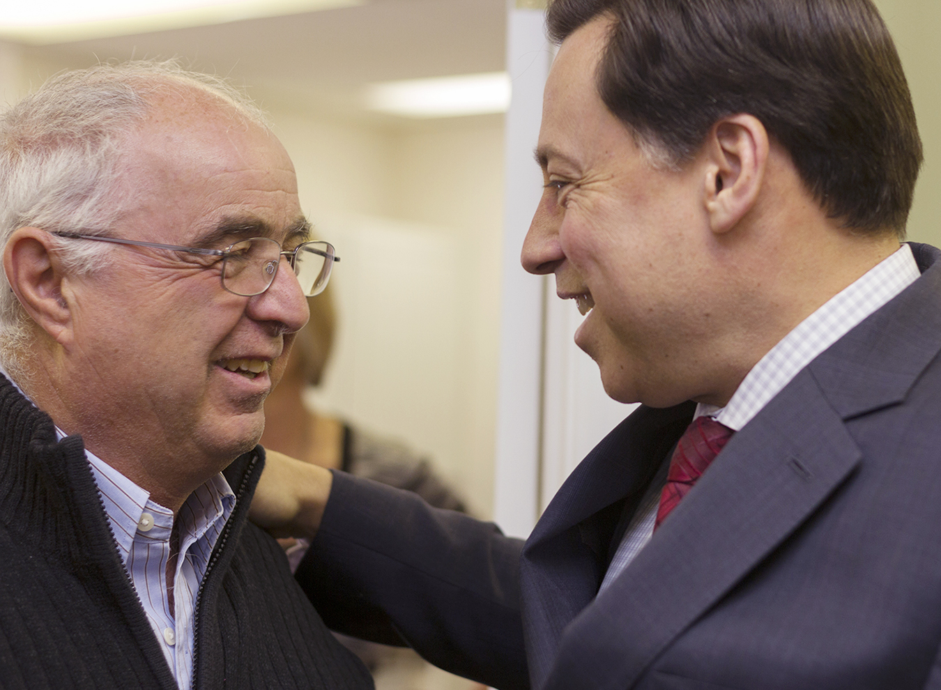BELLEVILLE – Ontario Minister of Training, Colleges and Universities Brad Duguid (right) greets Lou Rinaldi, who will be the Liberal candidate for Northumberland-Quinte West riding in the next provincial election. Duguid came to Belleville Friday to speak about the provincial government’s Youth Employment Fund at Loyalist Community Employment Services. Photo by Mandy Larade, Loyalist Photojournalism