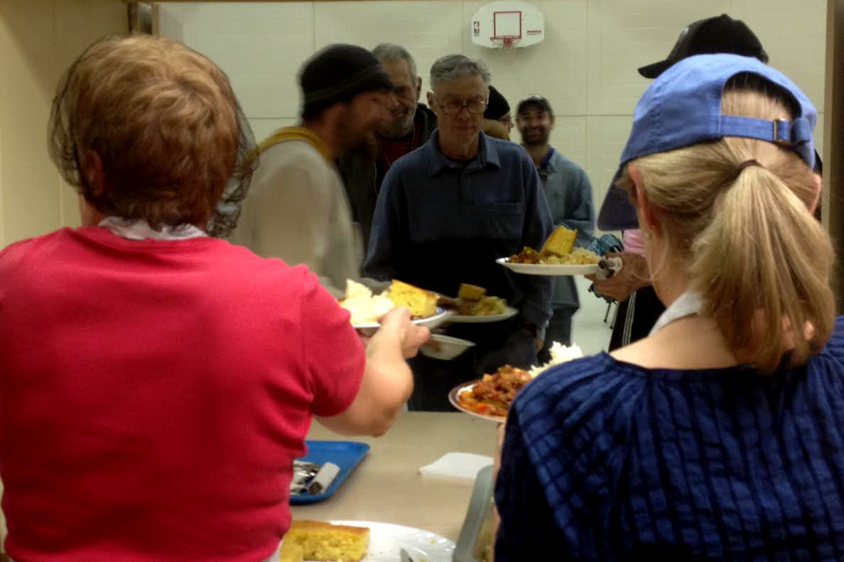 Mel Plewes, the volunteer who serves as chief cook for Inn From the Cold, said the numbers vary on a nightly basis. Wednesday night around 70 meals –vegetable-barley soup, hamburger stew, coleslaw, garlic mashed potatoes, cheese cornbread, apple crisp for dessert, and coffee and tea – were served.