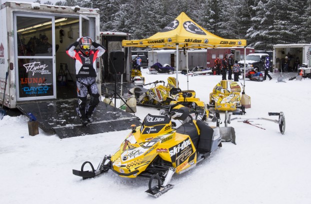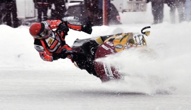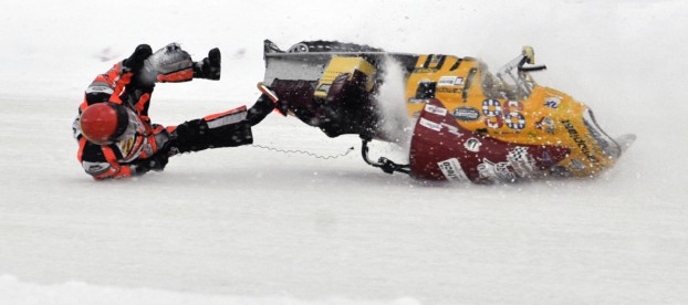 Jacques Villeneuve falling off from his snowmobile during the final race at the Hastings Cup. Photo by Kaitlin Abeele