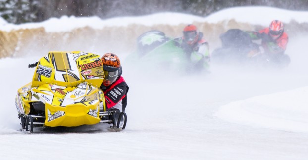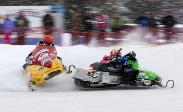 Snowmobiler legend Jacques Villeneuve (left) collides with Colt Dellandrea on the fourth turn of the Pro-Champ final at the 2014 Hastings Cup in Bancroft Feb. 2. Dellandrea won the race after Villeneuve was disqualified. Photo by Dillan Cools